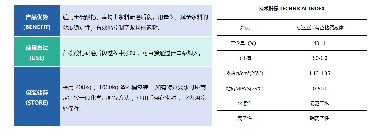 • HQ-S933M 分散劑,可與水任意比例互溶,提高碳酸鈣和高嶺土研磨后段料 漿的穩(wěn)定性。